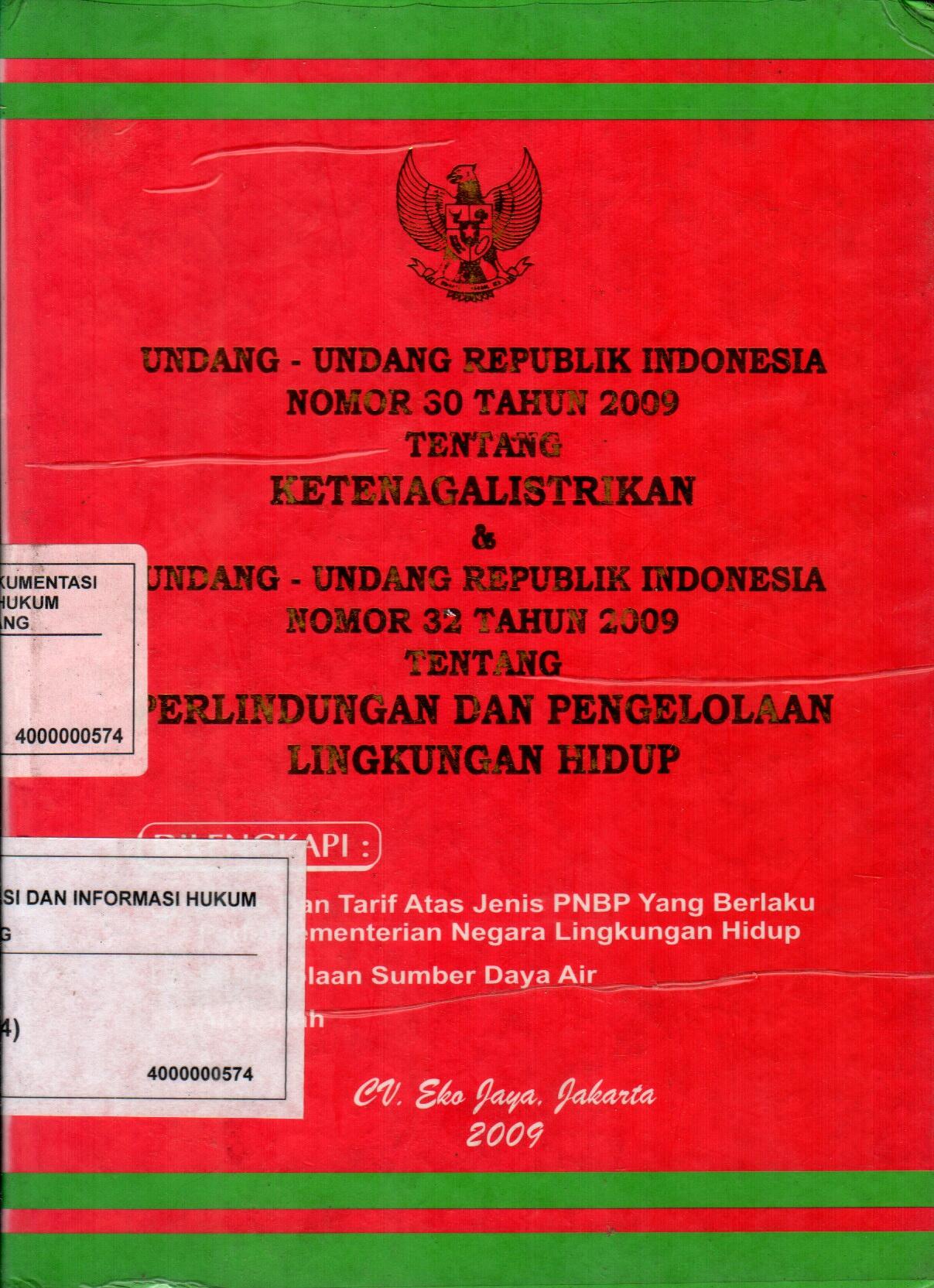 UNDANG UNDANG REPUBLIK INDONESIA NOMOR 30 TAHUN 2009 KETENAGALISTRIKAN& UNDANG UNDANG REPUBLIK INDONESIA NOMOR 32 TAHUN 2009 TENTANG PERLINDUNGAN DAN PENGELOLAAN LINGKUNGAN HIDUP