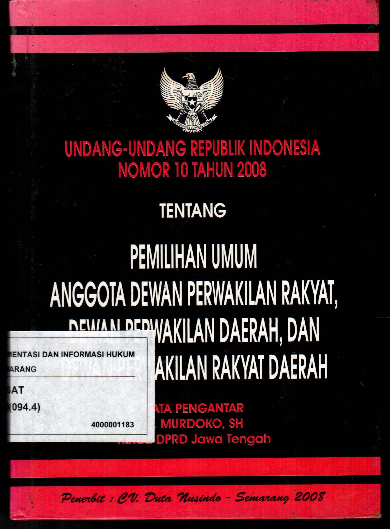 Undang-Undang Republik Indonesia Nomor 10 Tahun 2008 Tentang Pemilihan Umum Anggota Dewan Perwakilan Rakyat, Dewan Perwakilan Daerah, dan Dewan Perwakilan Rakyat Daerah