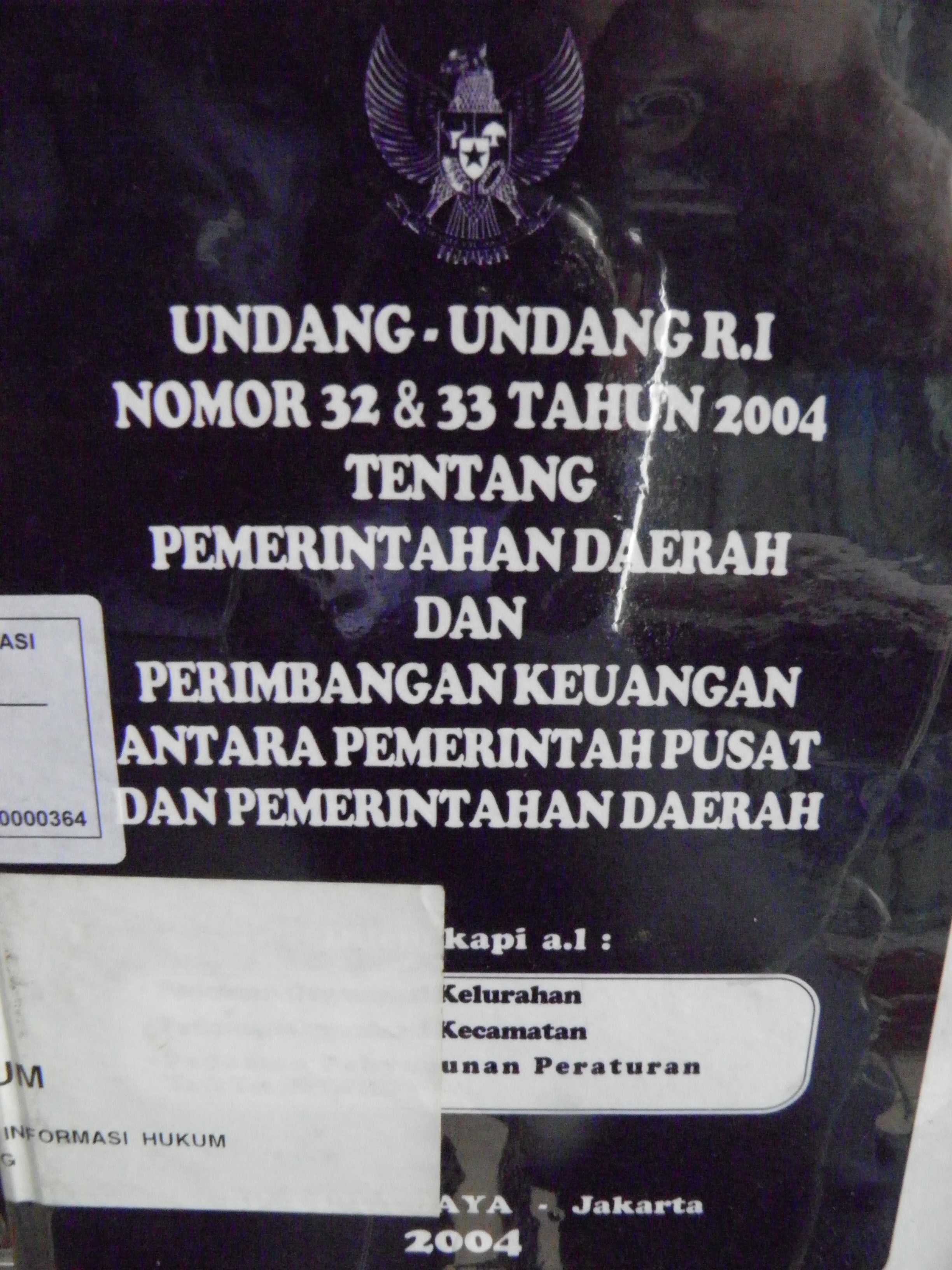 Undang - Undang R.I Nomor 32 dan 33 Tahun 2004 tentang Pemerintah Daerah dan Perimbangan Keuangan Antara Pemerintah Pusat dan Pemerintah Daerah Dilengkapi Pedoman Organisasi Kelurahan, Pedoman Organis