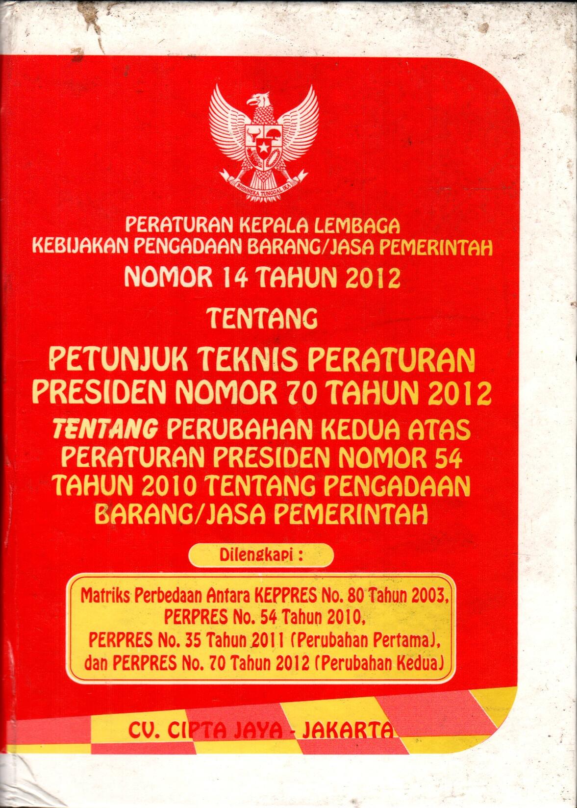Peraturan Kepala Lembaga Kebijakan Pengadaan Barang/Jasa Pemerintah Nomor 14 Tahun 2012 Tentang Petunjuk Teknis Peraturan Presiden Nomor 70 Tahun 2012 Tentang Perubahan Kedua Atas Peraturan Presiden Nomor 54 Tahun 2010 Tentang Pengadaan Barang/Jasa Pemerintah Dilengkapi: Matriks Perbedaan Antara KEPRES No. 80 Tahun 2003, PERPRES No. 54 Tahun 2010, PERPRES No. 35 Tahun 2011 (Perubahan Pertama), dan PERPRES No. 70 Tahun 2012 (Perubahan Kedua)