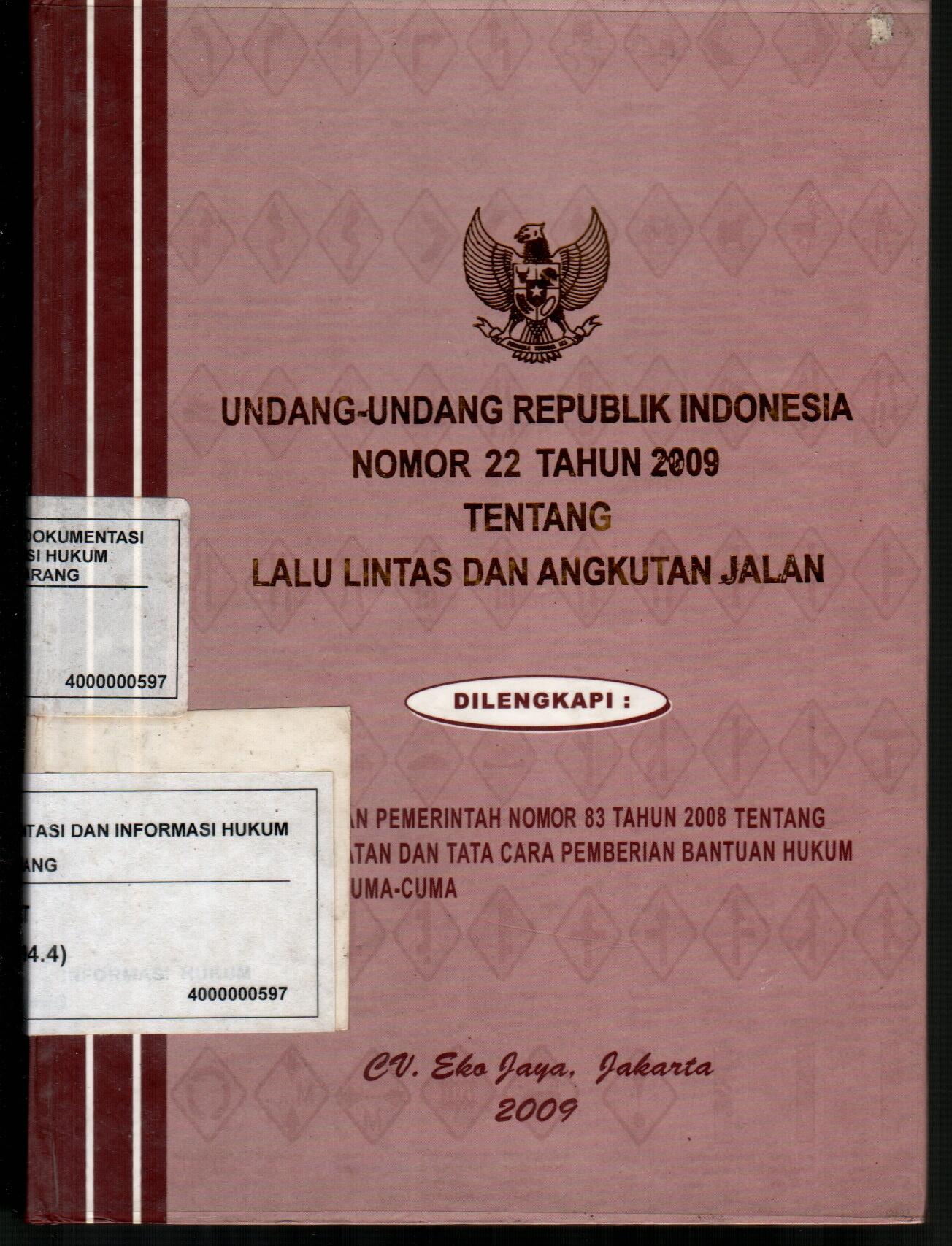 Undang-Undang Republik Indonesia Nomor 22 Tahun 2009 Tentang Lalu Lintas dan Angkutan Jalan