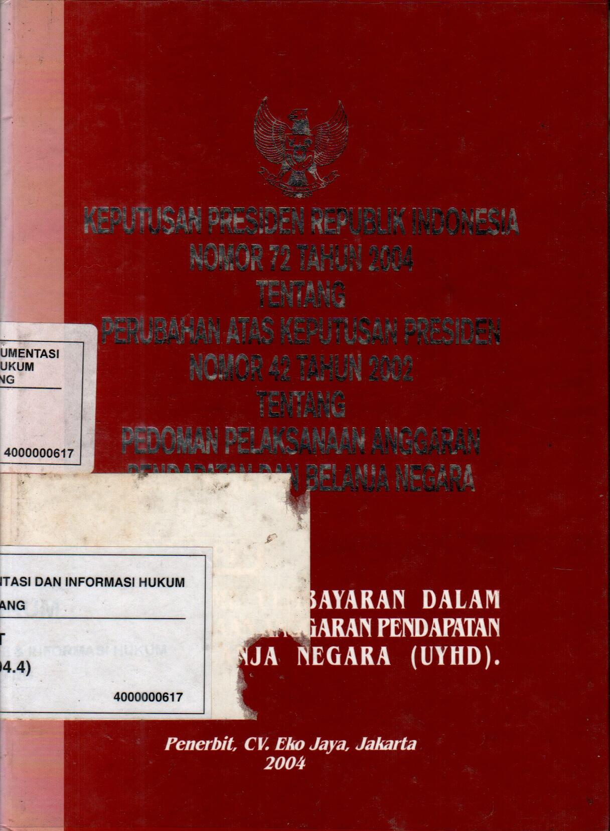 Keputusan Presiden Republik Indonesia Nomor 72 Tahun 2004 Tentang Perubahan Atas Keputusan Presiden Nomor 42 Tahun 2002 Tentang Pedoman Pelaksanaan Anggaran Pendapatan dan Belanja Negara