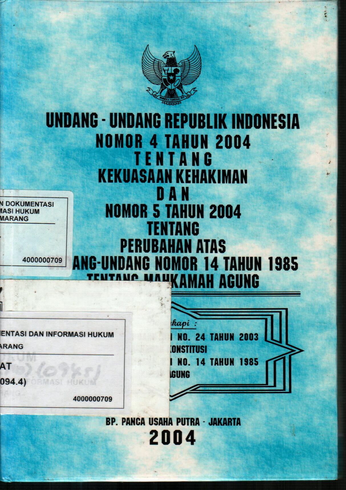 Undang-Undang Republik Indonesia Nomor 4 Tahun 2004 Tentang Kekuasaan Kehakiman Dan Nomor 5 Tahun 2004 Tentang Perubahan Atas Undang-Undang Nomor 14 Tahun 1985 Tentang Mahkamah Agung