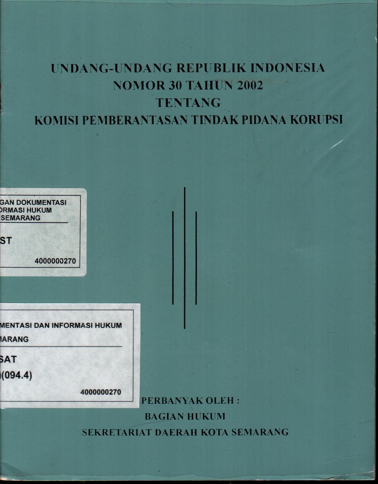 Undang-Undang Republik Indonesia Nomor 30 Tahun 2002 Tentang Komisi Pemberantasan Tindak Pidana Korupsi