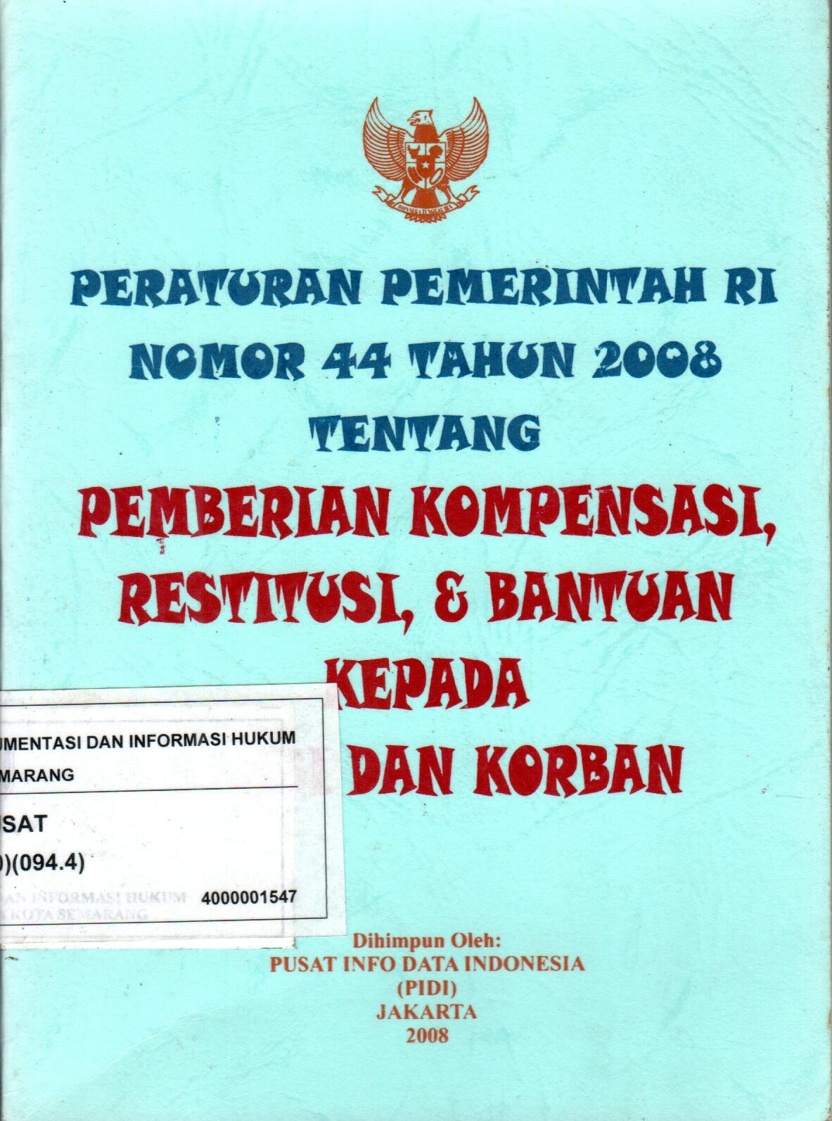Peraturan Pemerintah RI Nomor 44 Tahun 2008 Tentang Pemberian Kompensasi, Restitusi, & Bantuan Kepada Saksi dan Korban