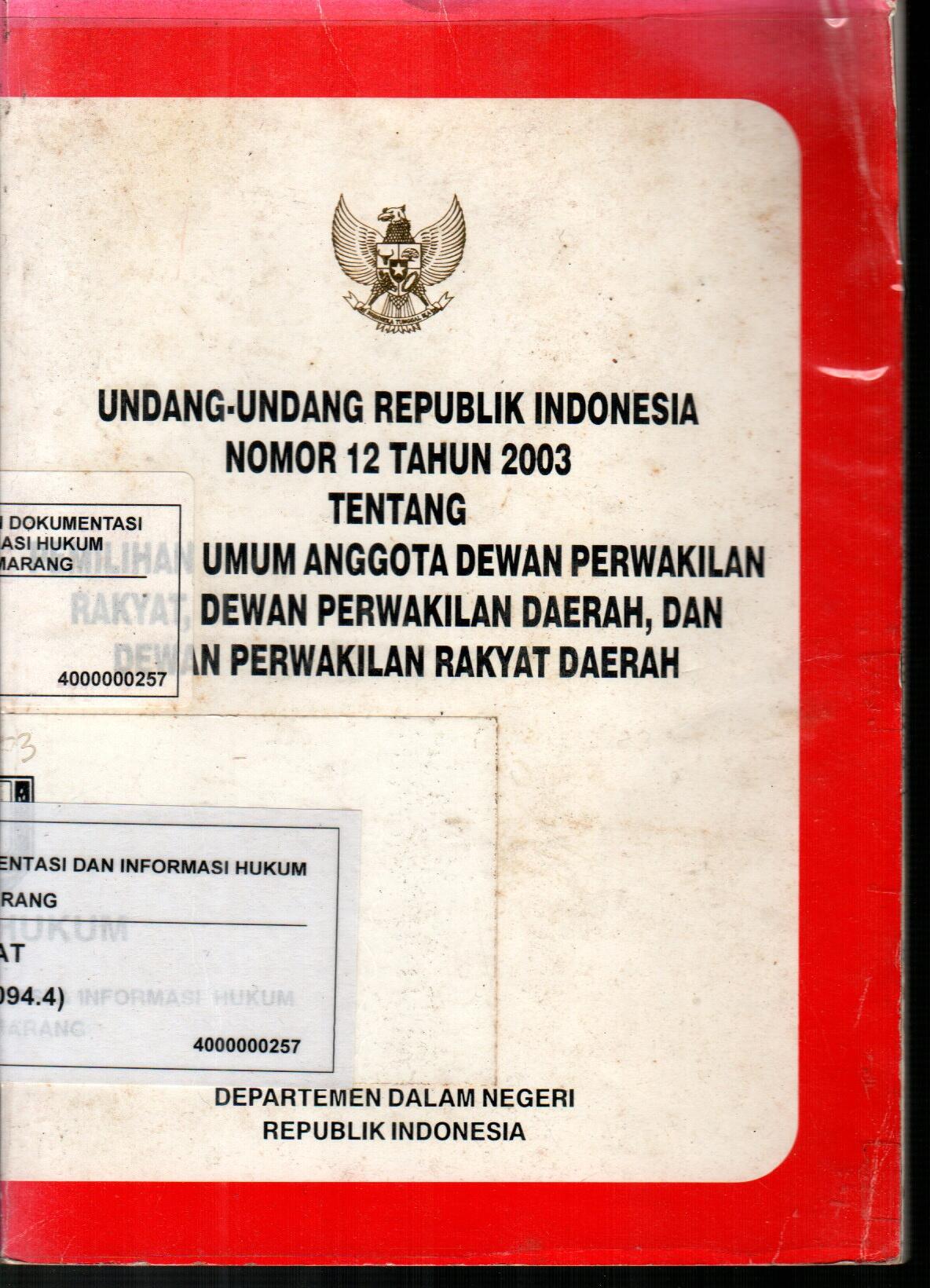 Undang-Undang Republik Indonesia Nomor 12 Tahun 2003 Tentang Pemilihan Umum Anggota Dewan Perwakilan Rakyat, Dewan Perwakilan Daerah, dan Dewan Perwakilan Rakyat Daerah