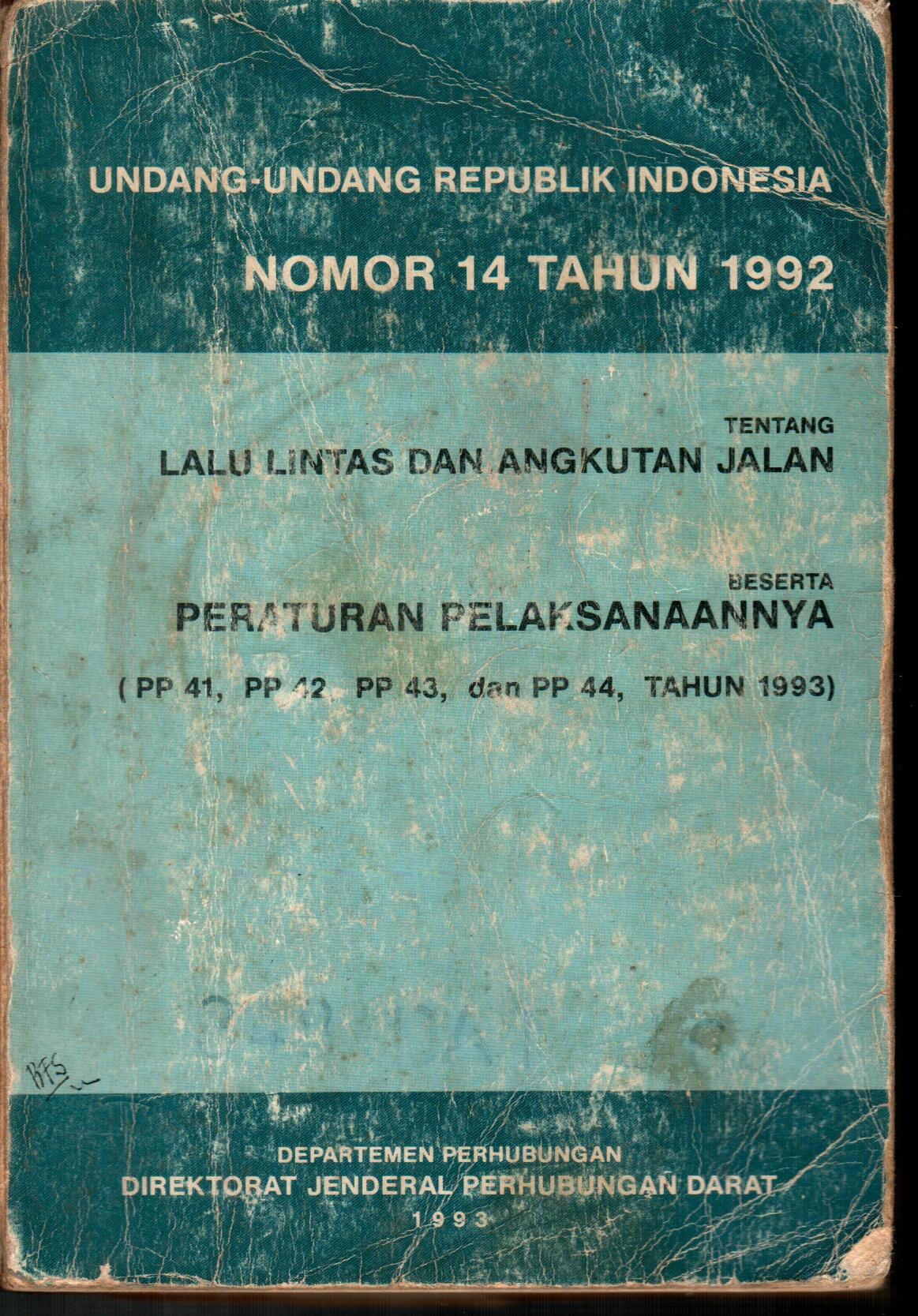 UNDANG-UNDANG REPUBLIK INDONESIA NOMOR 14 TAHUN 1992 TENTANG LALU LINTAS DAN ANGKUTAN JALAN BESERTA PERATURAN PELAKSANAANNYA