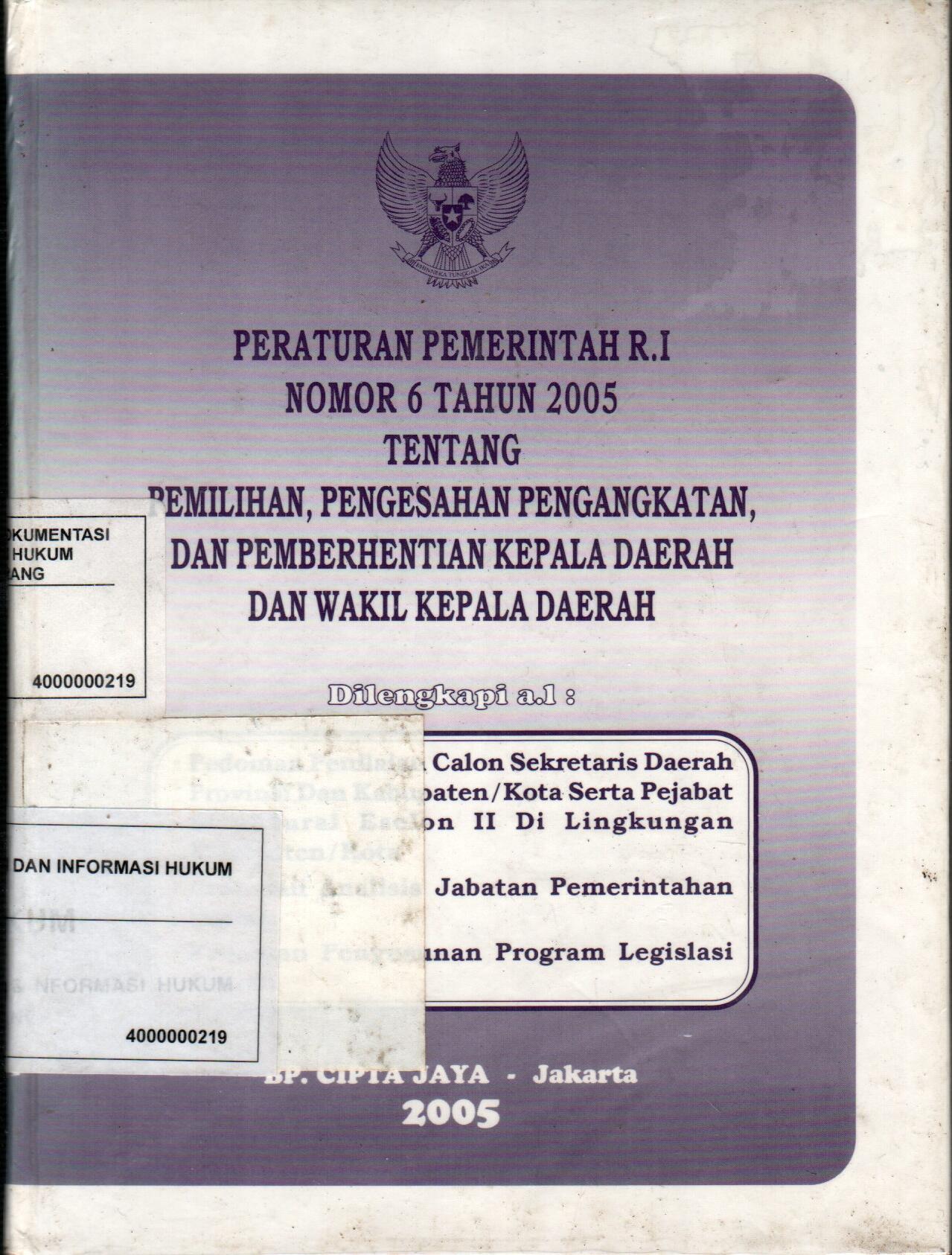 Peraturan Pemerintah R.I Nomor 6 Tahun 2005 Tentang Pemilihan, Pengesahan Pengangkatan, Dan Pemberhentian Kepala Daerah Dan Wakil Kepala Daerah