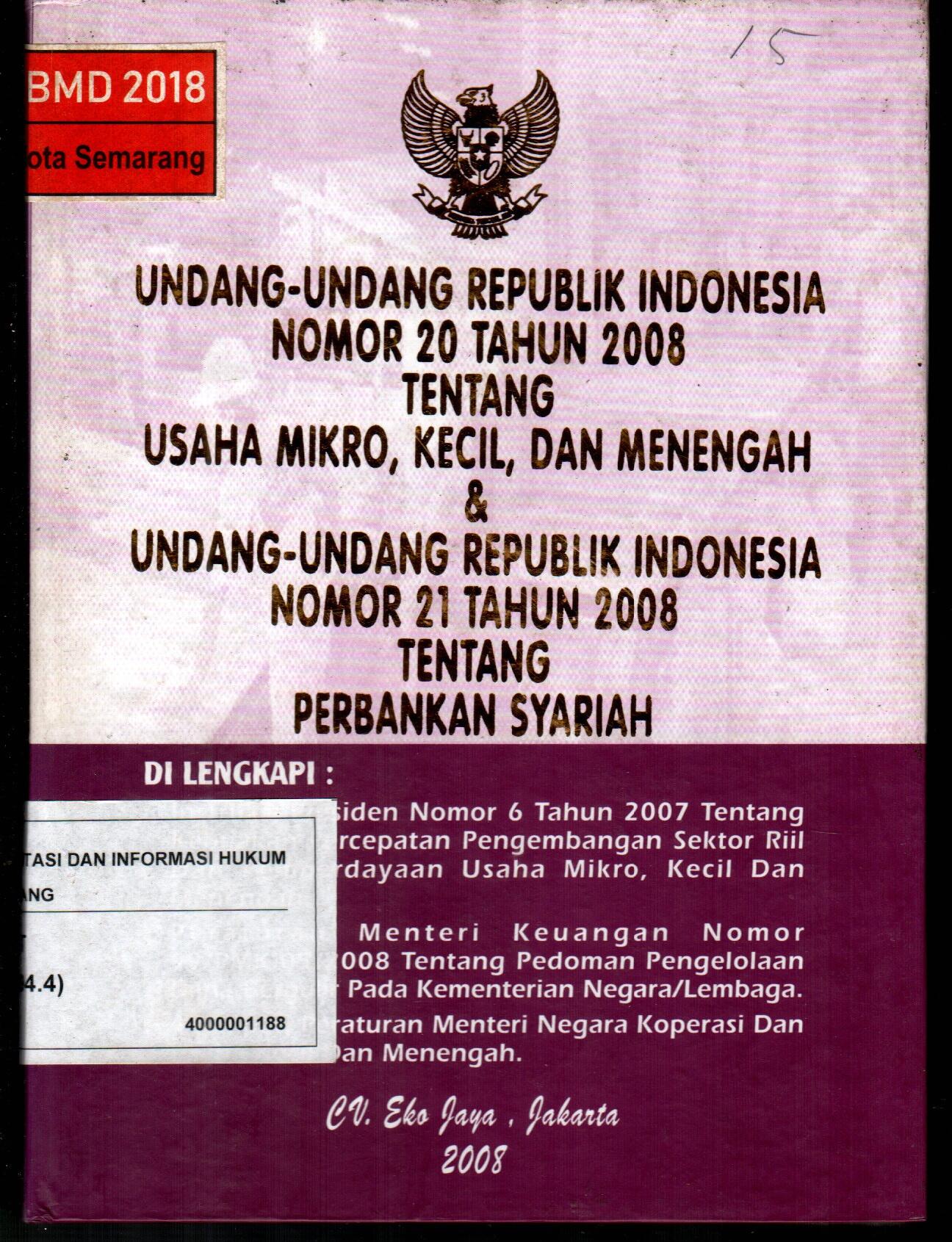 Undang-Undang Republik Indonesia Nomor 20 Tahun 2008 Tentang Usaha Micro, Kecil, dan Menengah & Undang-Undang Republik Indonesia Nomor 21 Tahun 2008 Tentang Perbankan Syariah