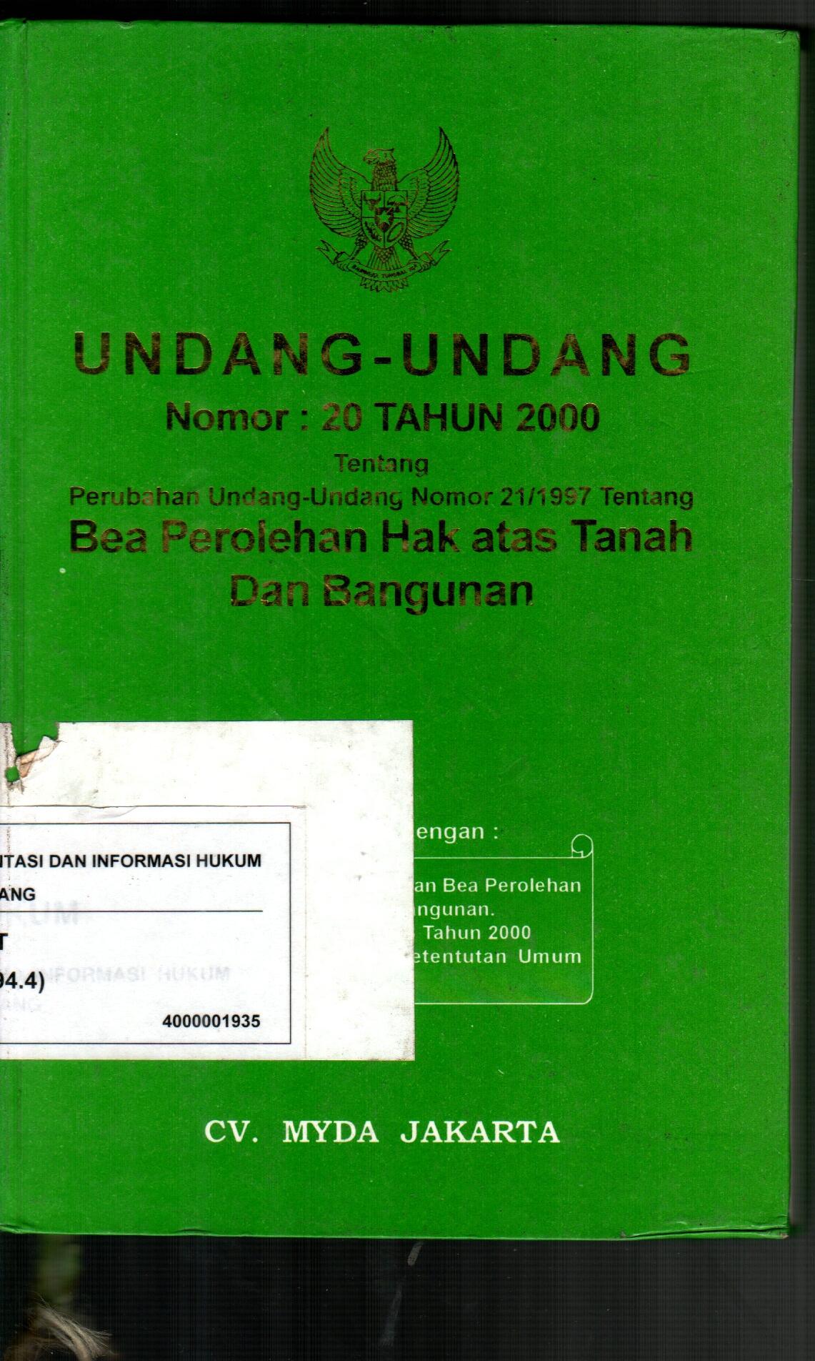 UNDANG-UNDANG NOMOR 20 TAHUN 2000 TENTANG PERUBAHAN UNDANG-UNDANG NOMOR 21/1997 TENTANG BEA PEROLEHAN HAK ATAS TANAH DAN BANGUNAN