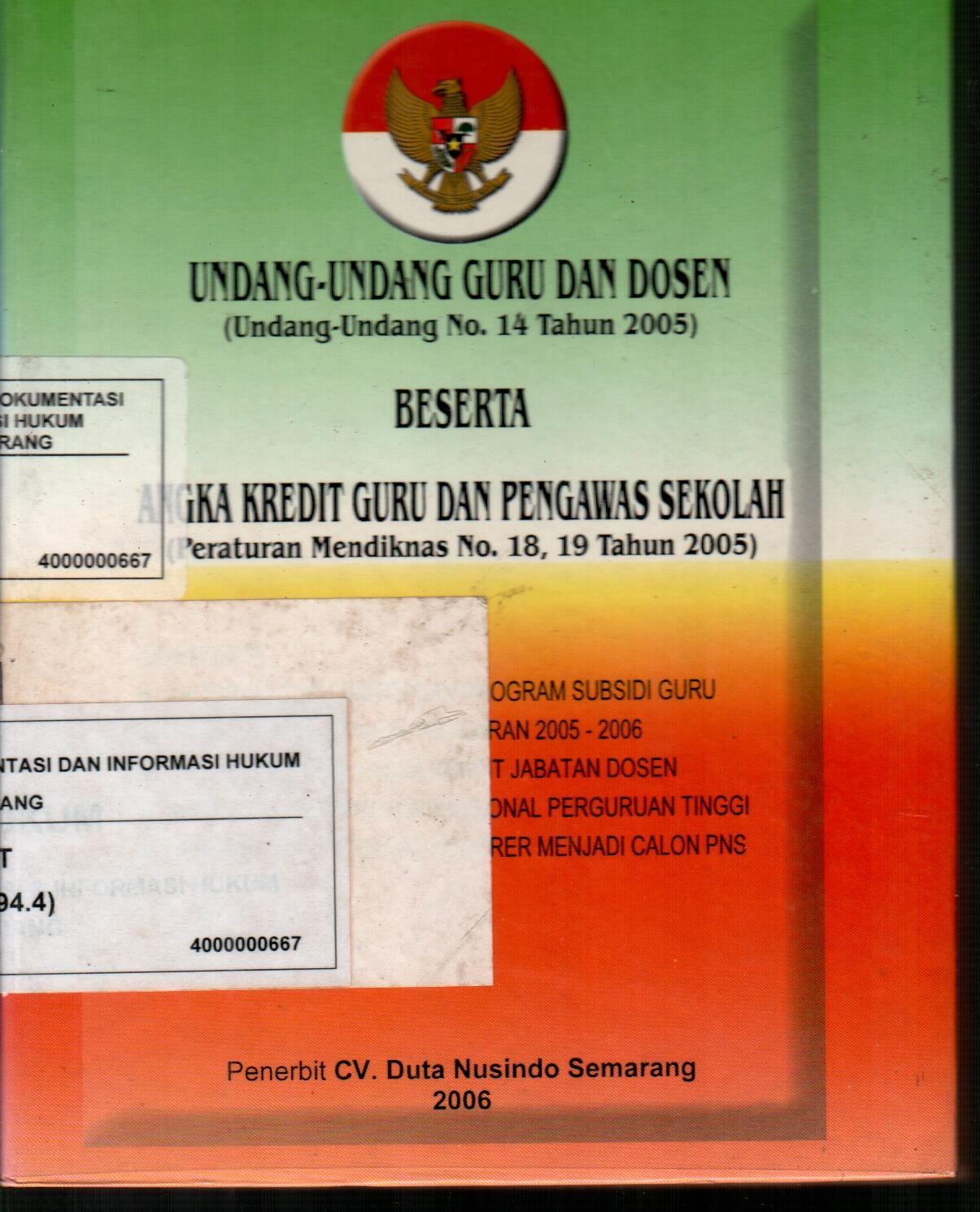 Undang-Undang Guru dan Dosen ( Undang-Undang Nomor 14 Tahun 2005) beserta angka kredit guru dan pengawas sekolah ( Peraturan Mendiknas No.18,19 tahun 2005)