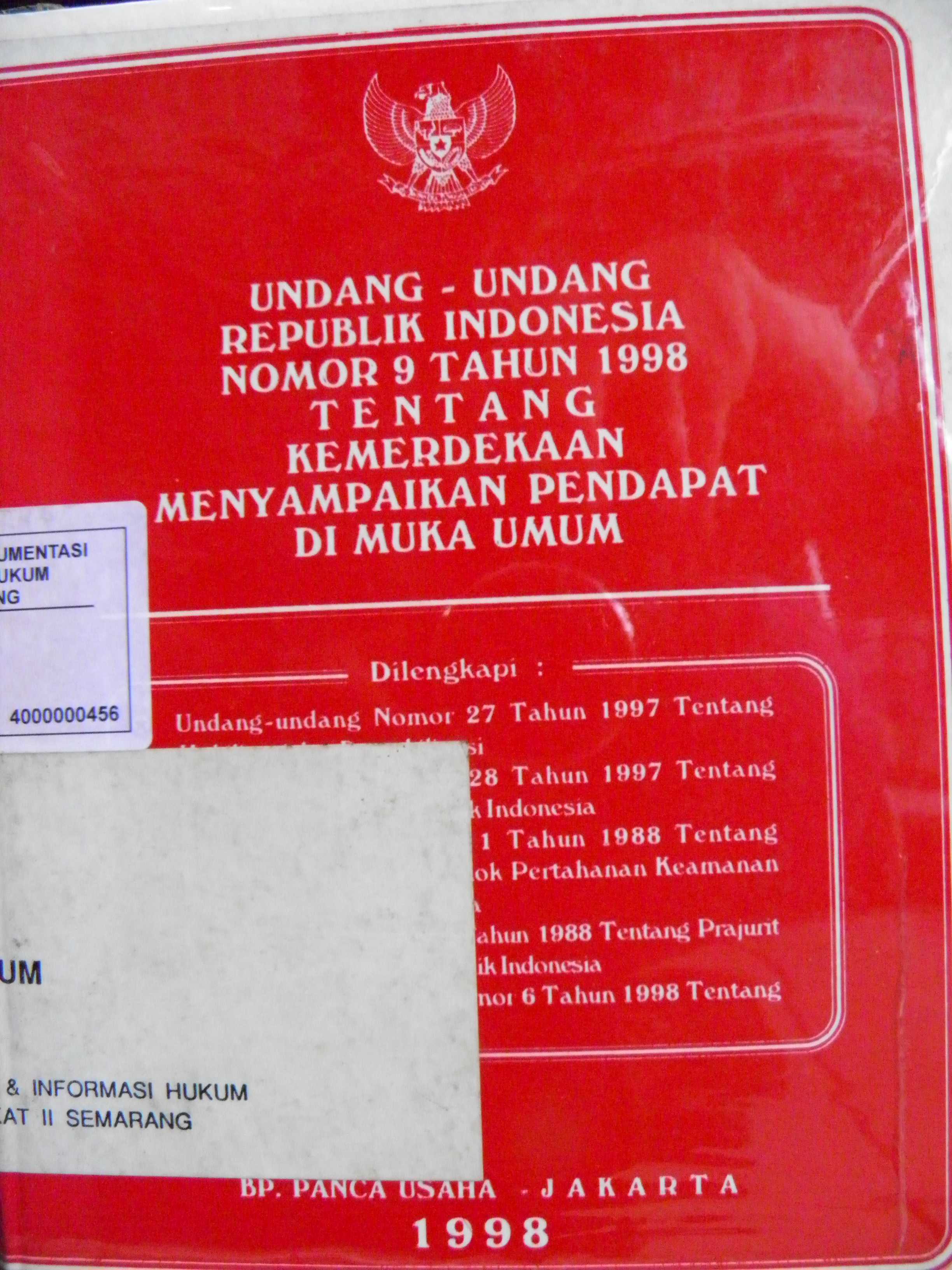 Undang - Undang Repoblik Indonesia Nomor 9 Tahun 1998 Tentang Kemerdekaan Menyampaikan Pendapat D Muka Umum. Dilengkapi : Undang - Undang Nomor 27 Tahun 1997 Tentang Mobilisasi dan Demobilisasi, Un