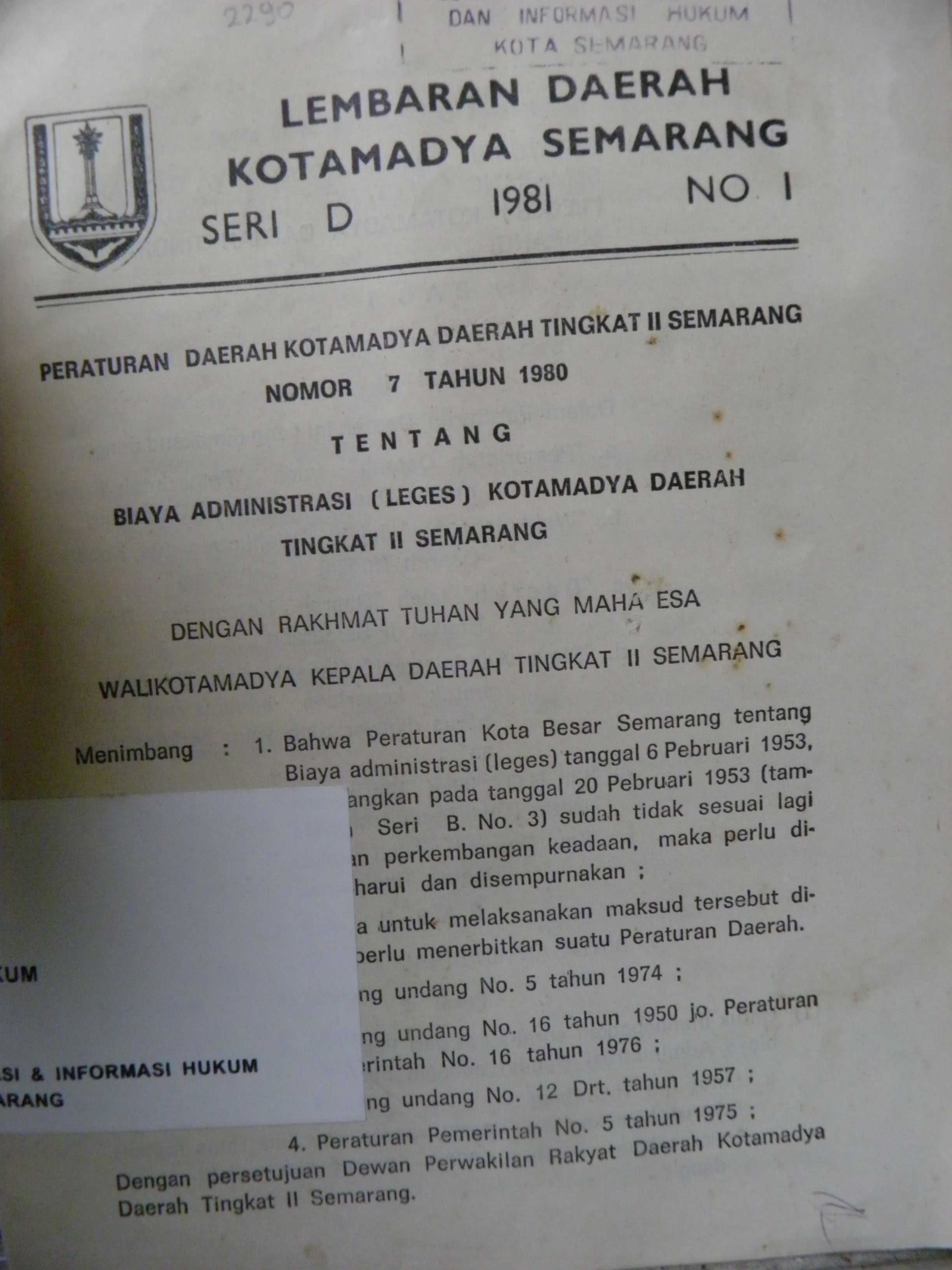 Peraturan Daerah Kotamadya Daerah Tingkat II Semarang Nomor : 7 Tahun 1980