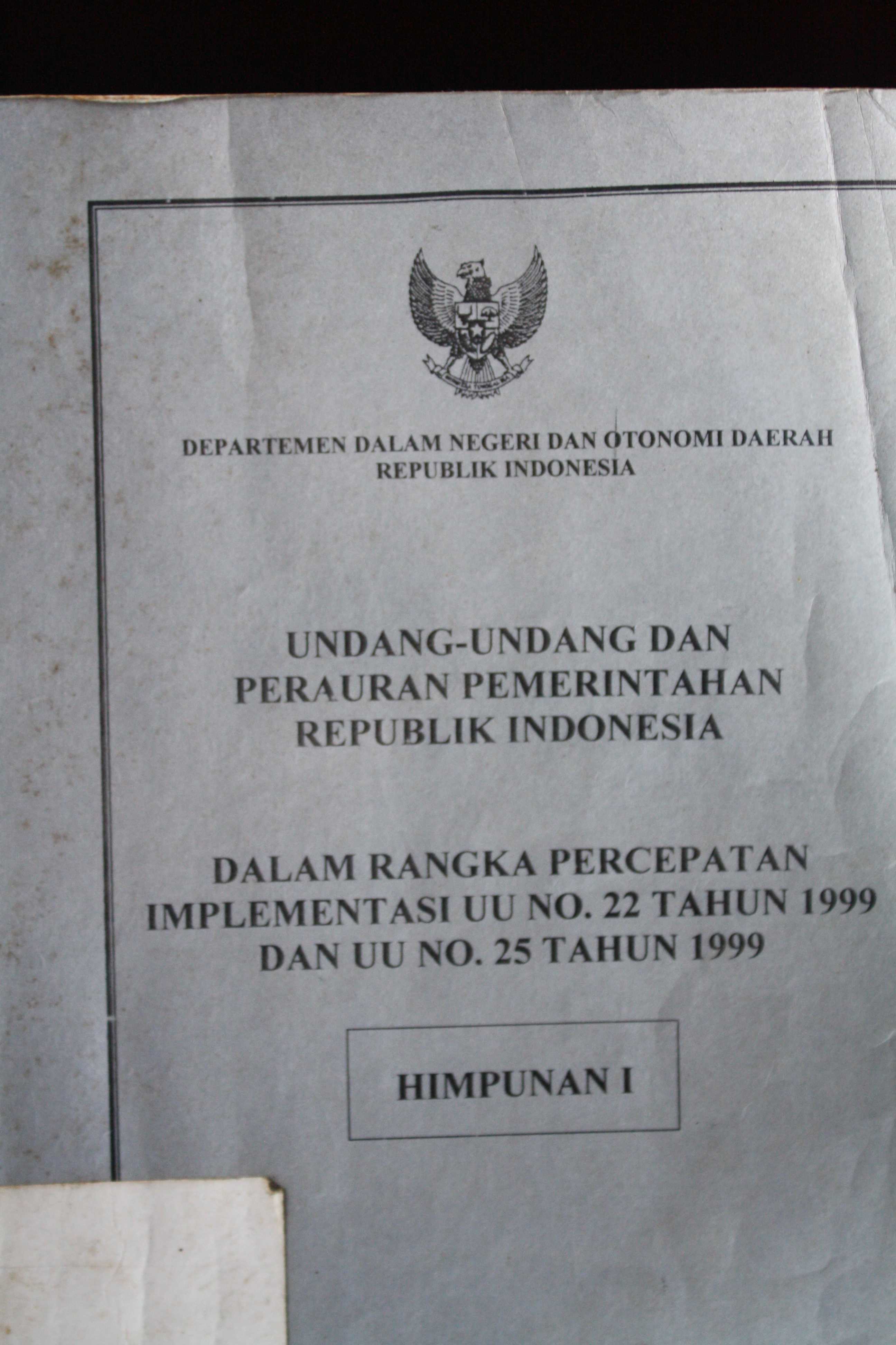 undang - undang dan peraturan pemerintahan republik indonesia dalam rangka Percepatan implementasi UU nomor 22 tahun 1999 dan UU no. 25 Tahun 1999
