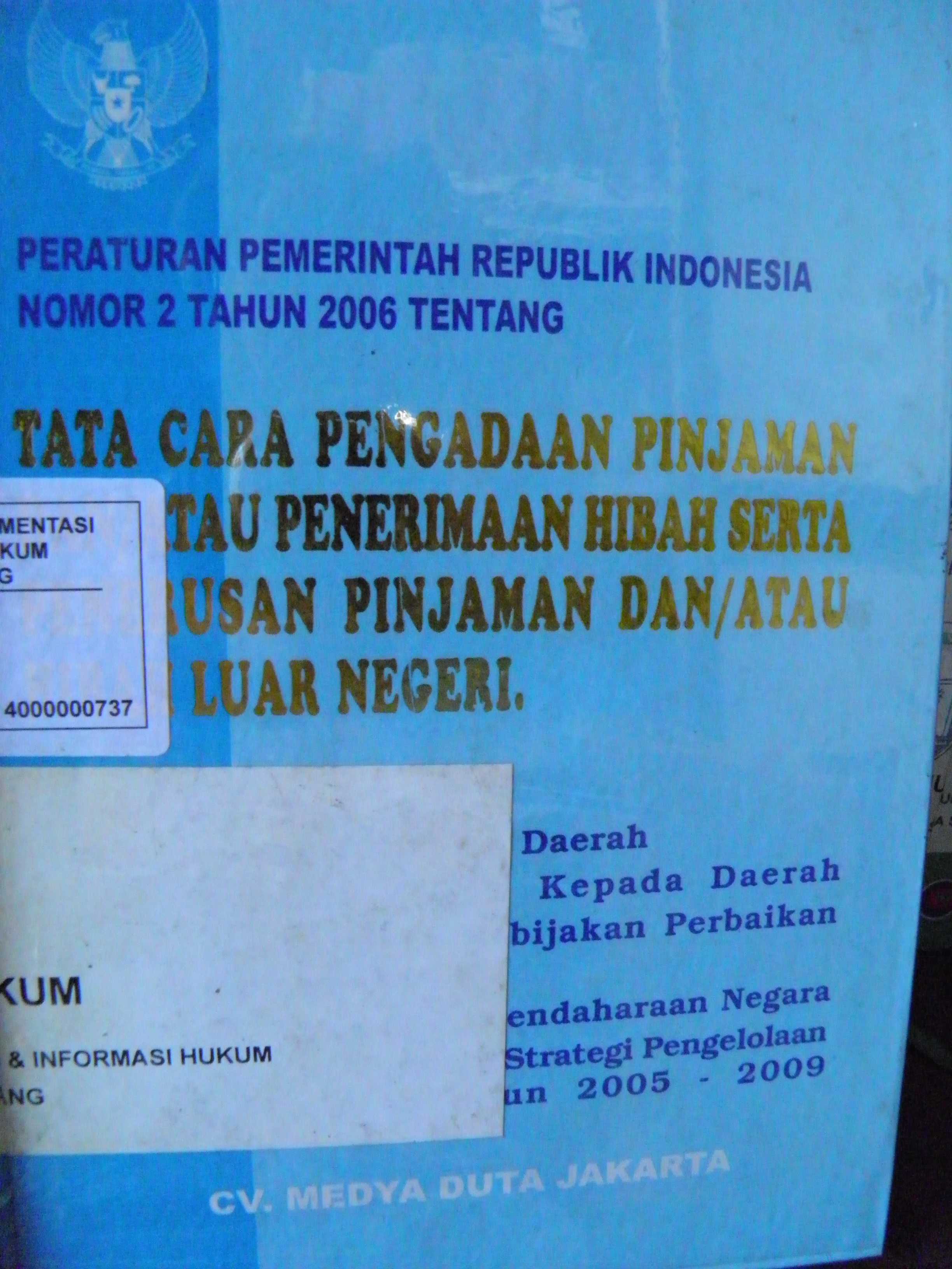 Peraturan Pemerintah Republik Indonesia Nomor 2 Tahun 2006 Tentang Tatacara Pengadaan Pinjaman dan/ Atau Penerimaan Hibah Serta Penerusan Pinjaman Dan/ Atau Hibah Luar Negeri.